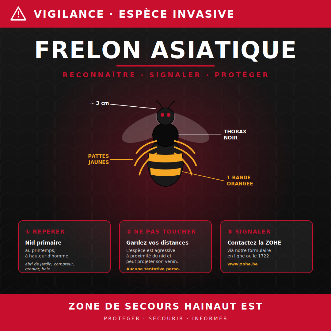 🚒 Notre rôle La Zone de Secours Hainaut Est intervient sur les nids primaires avec des équipements de protection spécifiques. Pour les nids secondaires en hauteur, nous travaillons en lien avec le CRA-W (Centre wallon de Recherches agronomiques) qui pilote la lutte au niveau régional.